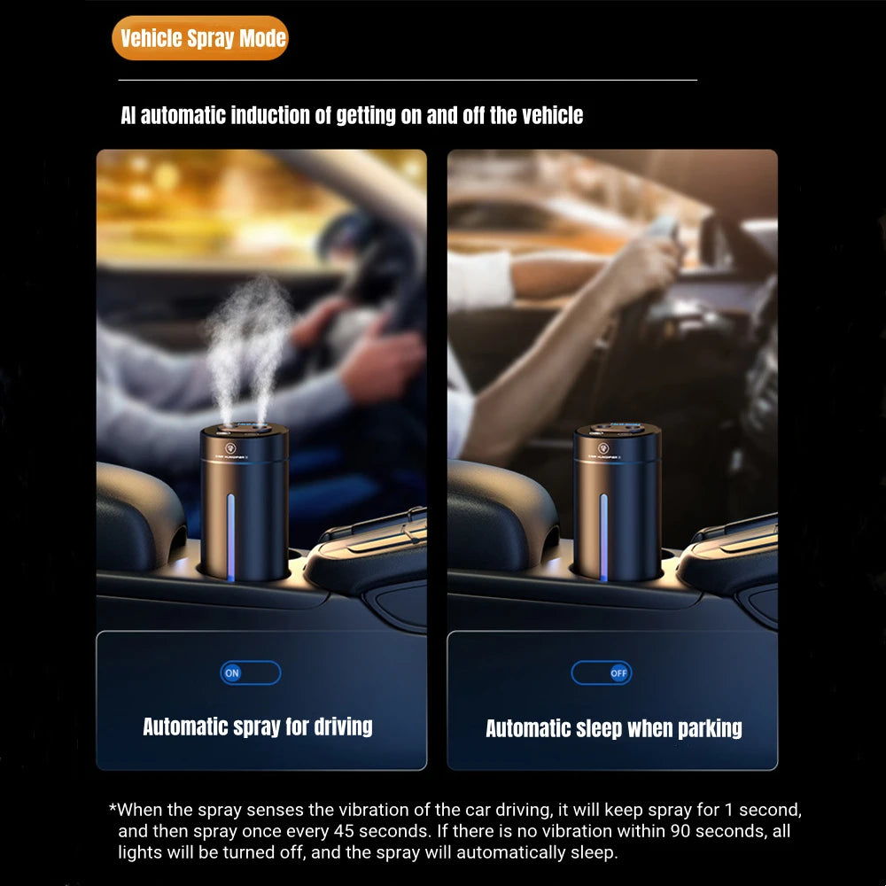 Start and stop with the vehicle. Automatic spray when car starts, automatic sleep when car stops. When the humidifier senses the vibration of the car driving, it will keep spray for 1 second, and then spray once every 45 seconds. If there is no driving vibration within 90 seconds, all lights will be turned off and the spray will automatically enter the sleep state.