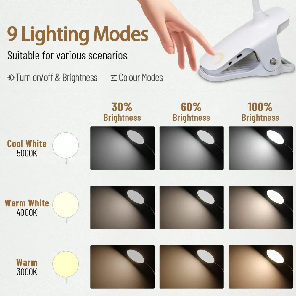 20 LED 3 Color Mode Desk Lamp Reading Light Clip-on Desk Light Eye Caring Read Light Rechargeable Book Light Read Night Light