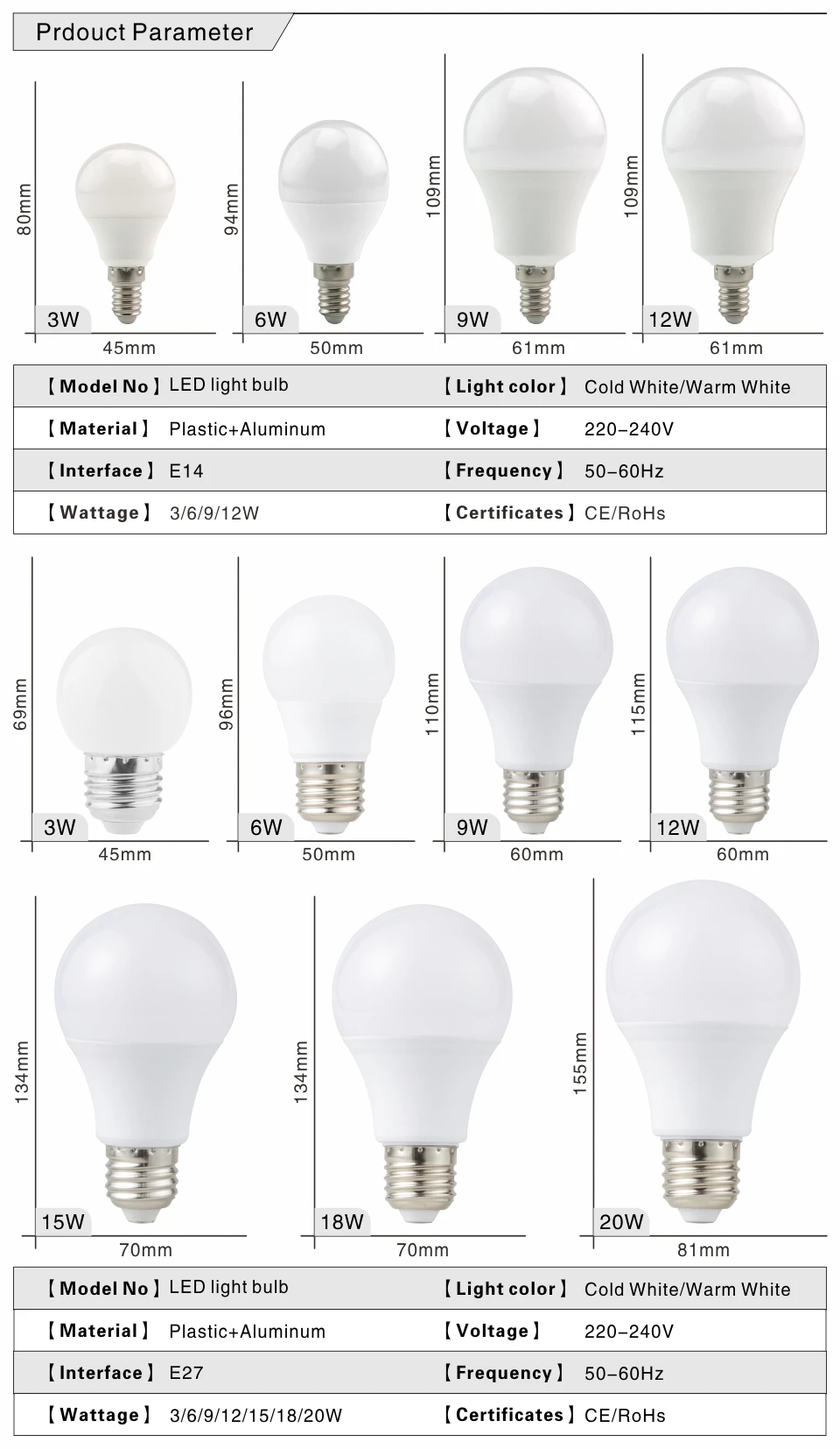 2pcs LED E27 E14 Bulb Light 3W 6W 9W 12W 15W 18W 20W Real Power Light Bulbs AC 220V-240V Spotlight Lampada LED Bombillas Lamp
