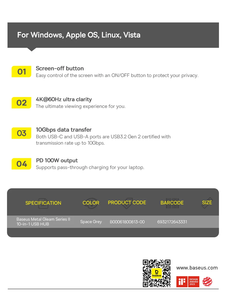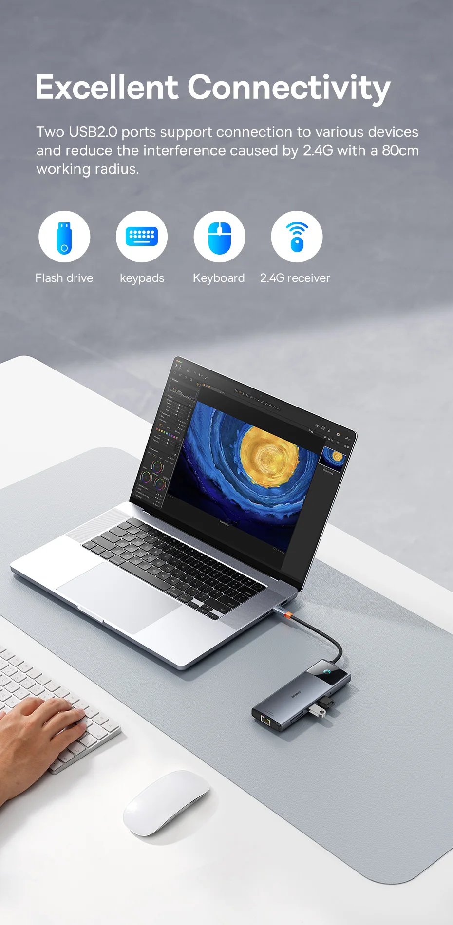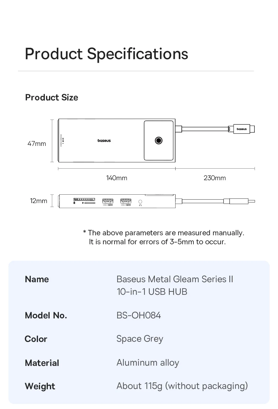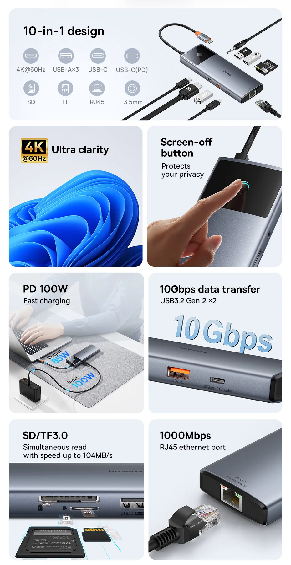 Baseus 4K@60Hz USB hub HDMI-compatible for Steam Deck Metal Gleam USB 3.2 Gen 2 USB C Hub Adapter for Laptop Accessories