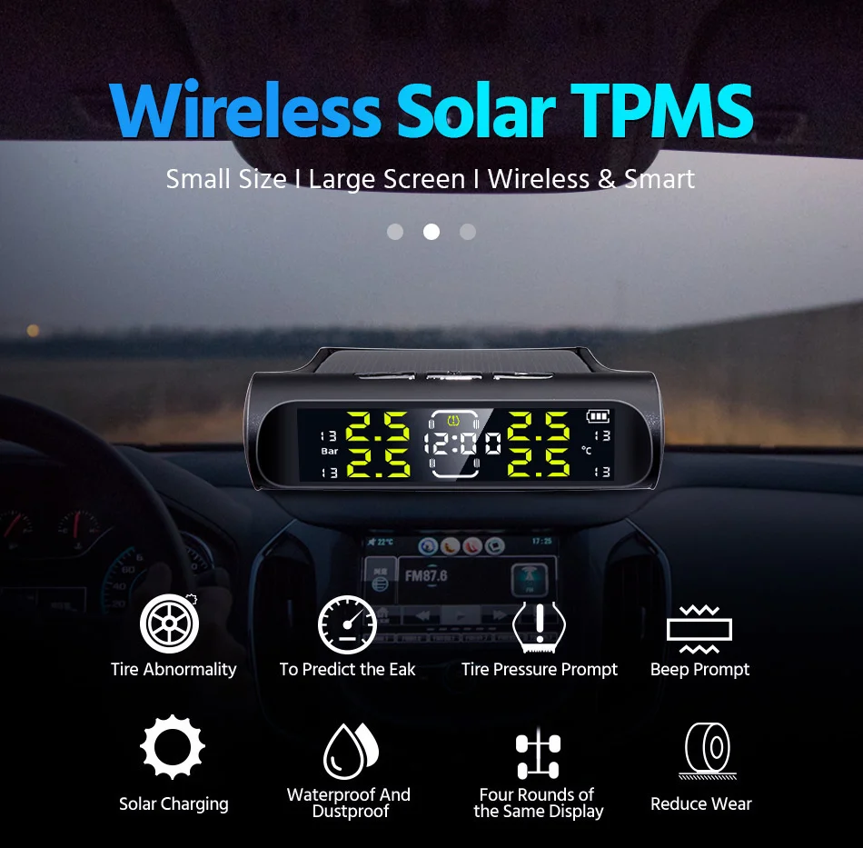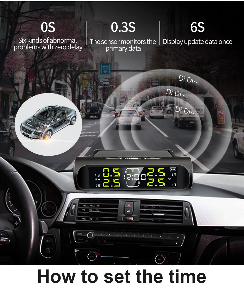 E-ACE Electronic Clock Car TPMS 4 Wheel Tyre Pressure Monitoring System Solar Power USB Charge TPMS Auto Security Alarm Device