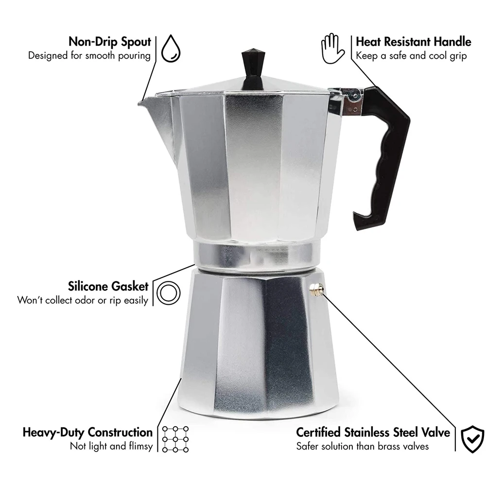 DURABLE AND INNOVATIVE DESIGN – Carefully crafted with strong, long-lasting aluminum. Provides thorough and even heat distribution for enhanced flavor and aroma. The durable flip-top lid features a temperature resistant knob and handle that allows for easy, safe pouring. The safety-release valve controls the pressure at which water is delivered to coffee grounds at a set, pre-determined level for perfectly extracted espresso, every time. Hand wash with soap to ensure long-lasting quality.
