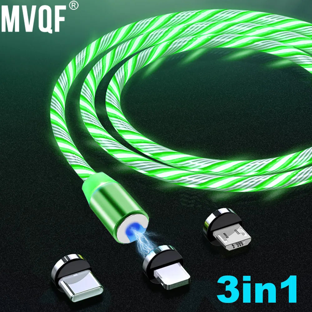 MVQF 3in1 Magnetic Flow Luminous Lighting Charging Mobile Phone Cables Cord Charger Wire for Xiaomi LED Micro USB C for Iphone