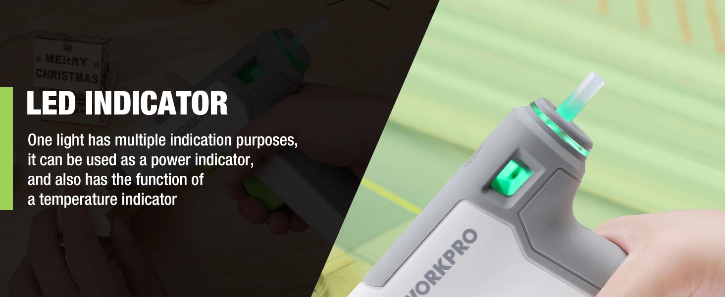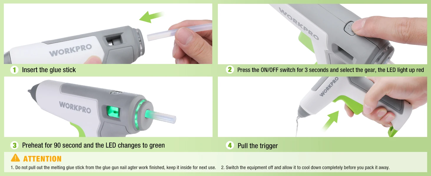 Press and hold the switch for 3 seconds to power on, the window above the glue gun handle and the indicator light of the glue stick position are all red lights; when working after 100-120s: the lights in both positions are green lights;