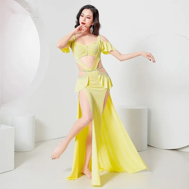 Belly Dance Costume Baladi Dress Women 2 Piece Set French Sexy Elegant Ruffle Sleeve Top Sexy Side Split Skirt Long Cream New