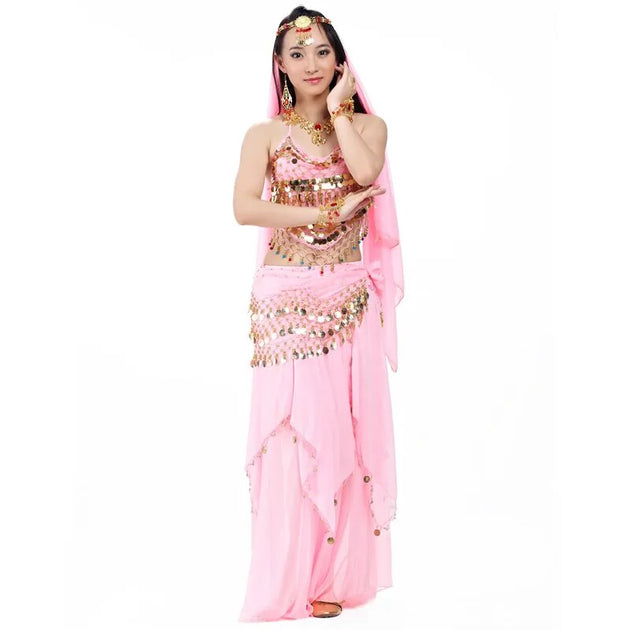 Indian Costume Set 5-pieces Belly Dance Veil Top Coins Hip Scarf Skirt Belly Dance Costume Women