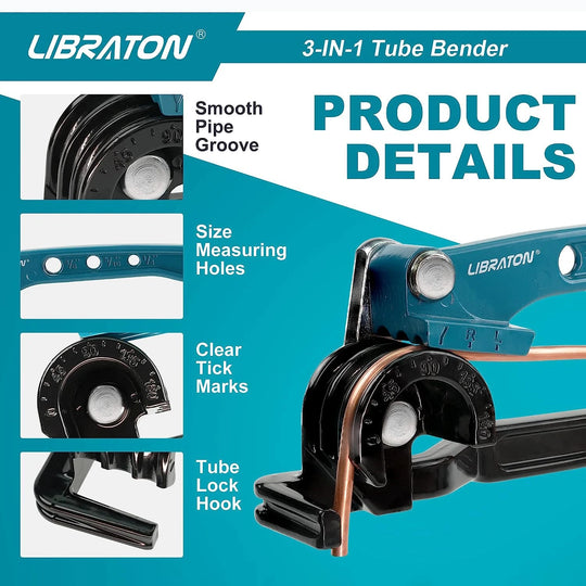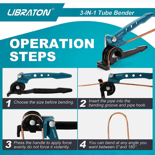 Libraton Copper Tube Bender, Tubing Bender 180°, Tube Bender 1/4", 5/16", 3/8", 3in1 Copper Pipe Bender, Copper Tubing Bender