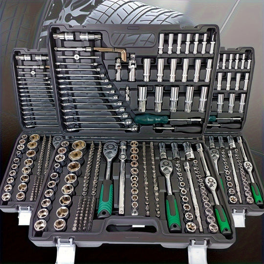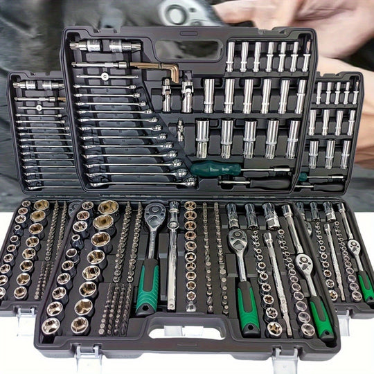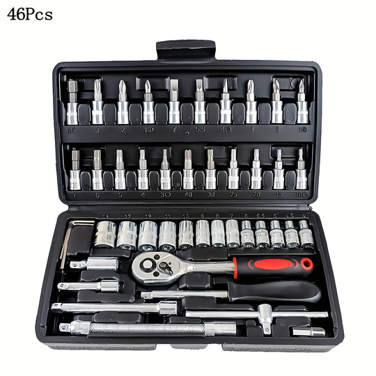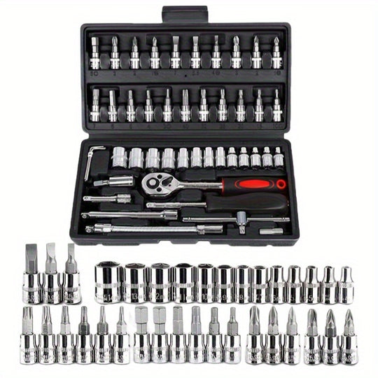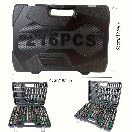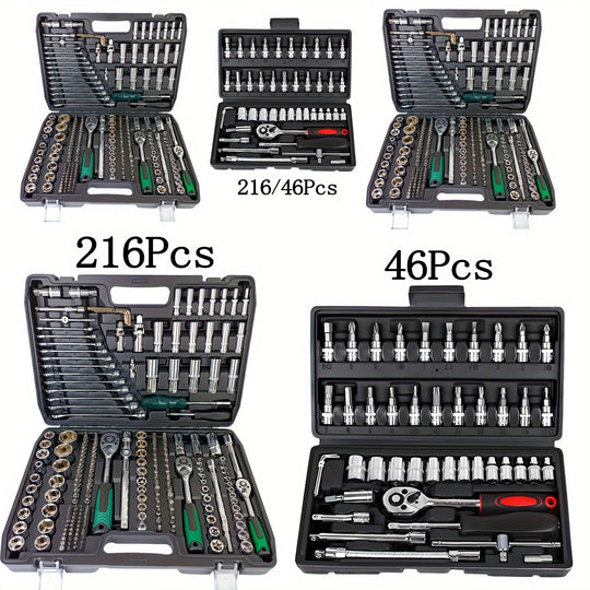 Black 46&216pcs Outdoor Car Emergency Repair Tool Kit with Plastic Storage Box, Motorcycle Repair Tool Set, Outdoor Cycling Emergency Bicycle Maintenance Tools, Includes Hex Wrenches, 1/2*1/4" & 3/8" Drive Depth and Standard
