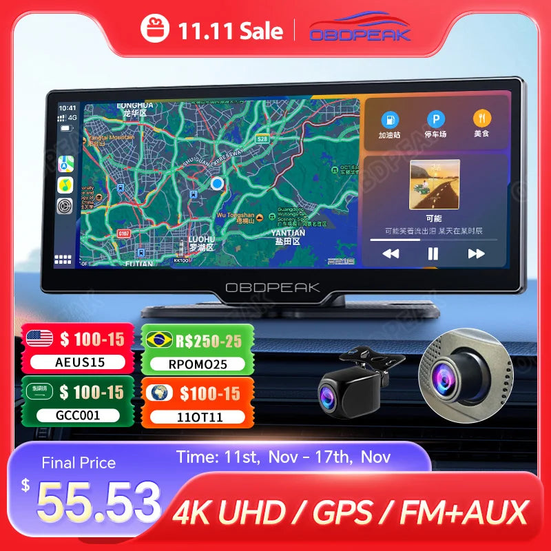 10.26" Dash Cam Rearview Camera Wifi Carplay & Android Auto 4K DVR GPS Navigation Video Recorder Dashboard Dual Len 24H Park AUX