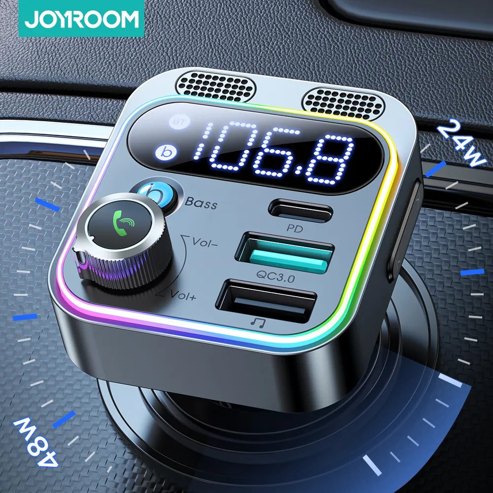 2022 Bluetooth 5.3 FM Transmitter for Car, JOYROOM [Stronger Dual Mics & HiFi Deep Bass Sound] , 48W PD&QC3.0 Bluetooth Car Adapter, Hands-Free Calling, Larger LED, AUX Output & U Disk Fast Car Charger