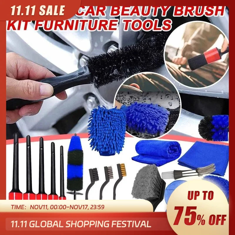 20PCS Car Cleaning Brush Set Wheel Tire Detailing Brush Kit Rim Brush Car Drill Brushes Wash Mitt Wax Pads Towels Cleaning Tool