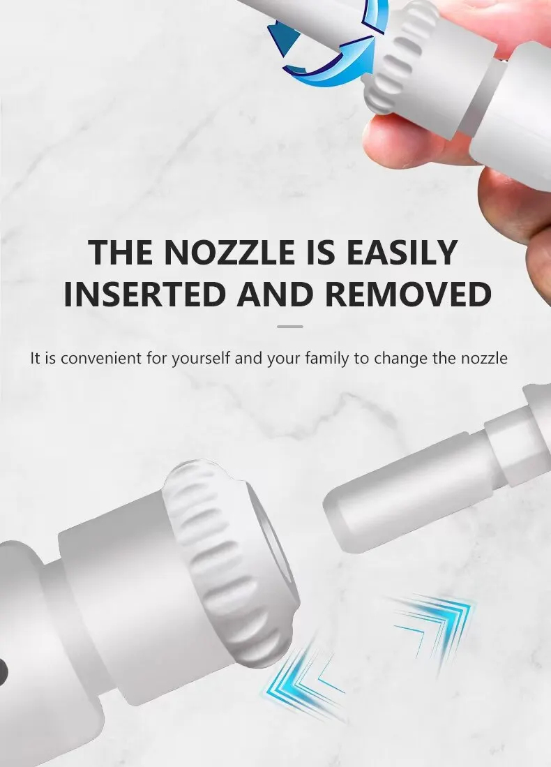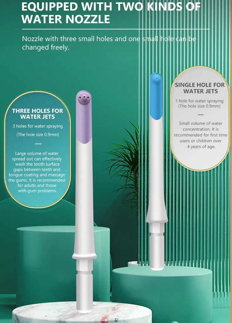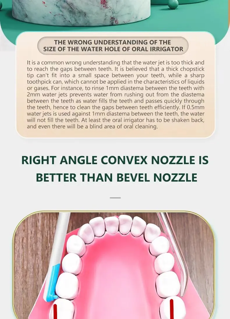4: Nozzle with right angle & convex hole. Nozzle with right angle & convex hole can accurately rinse the interdental diastema between the teeth. The convex hole of the nozzle contacts the interdental diastema or chink between the teeth and moves slowly to rinse. Most of the electric oral irrigator are used with a bevel nozzle, which makes it difficult to rinse the teeth inside and the diastema or chink between the
