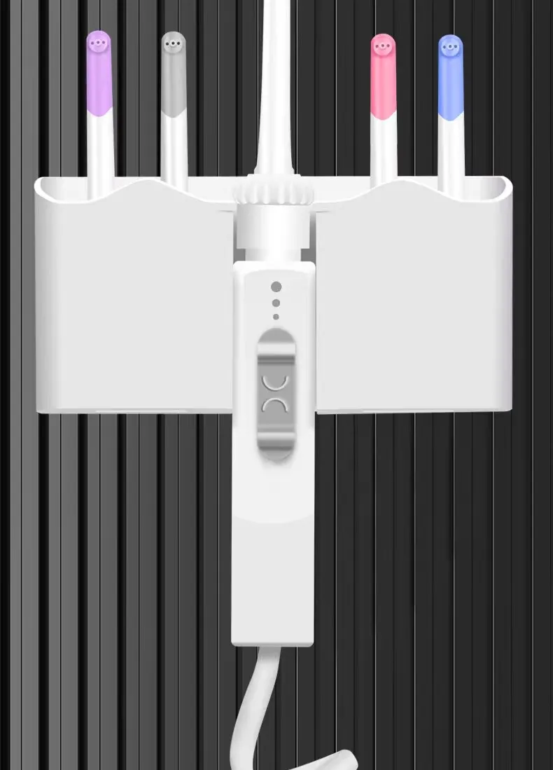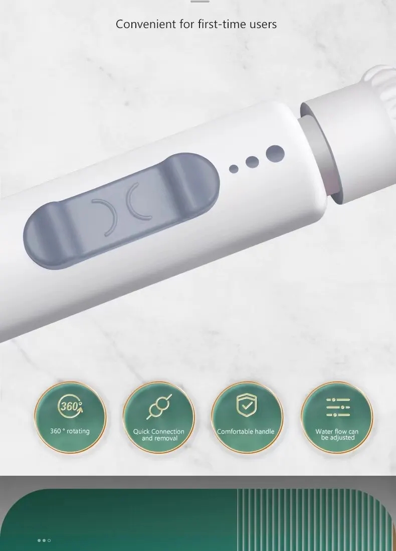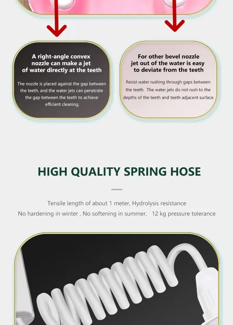 3: Three jets of water. Three jets of water with large amount of water, can efficiently rinse diastema between the teeth and tooth surface and tongue coating. It can also massage large area of gums, while electric handheld ones can only spray a small jet of water. The rinsing and the massage effect are not as good as three jets of water.