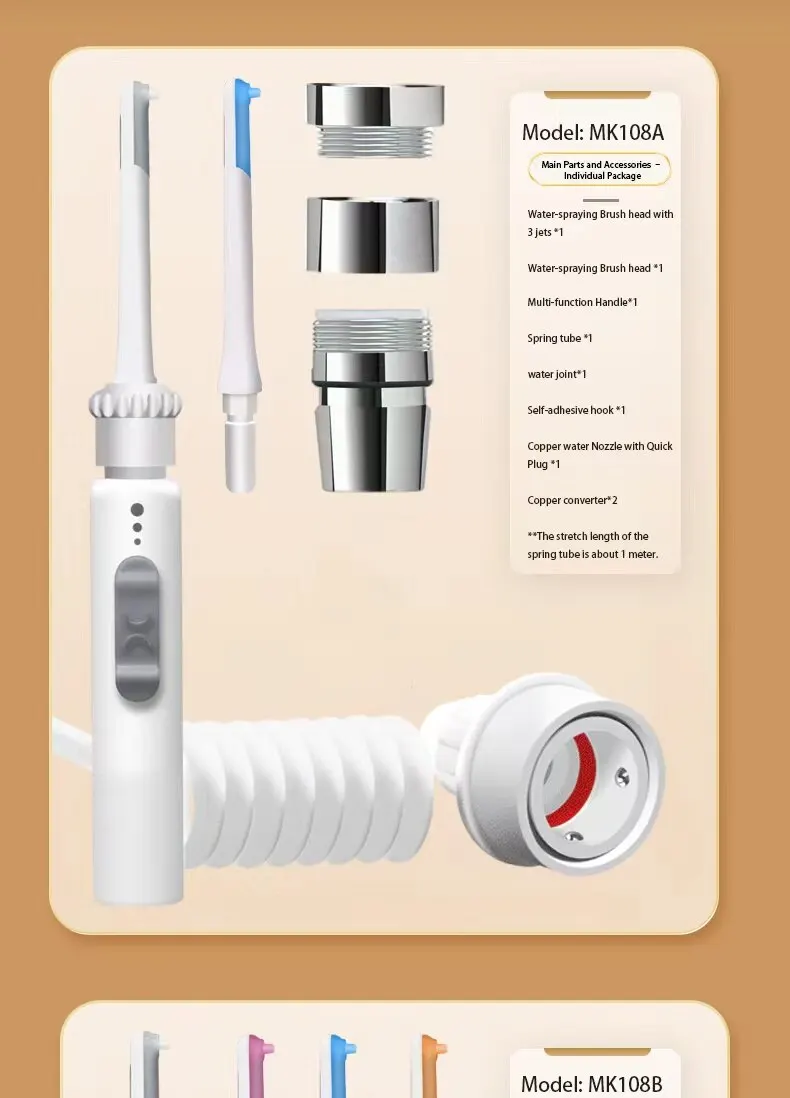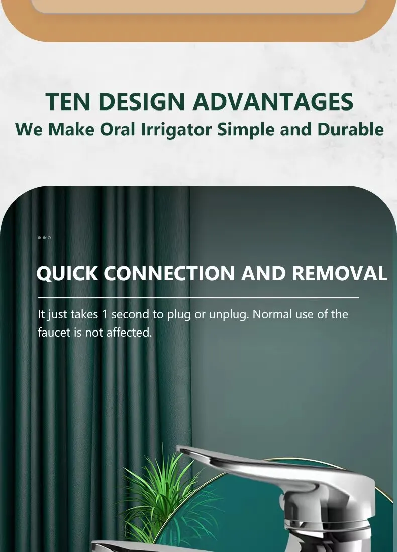 2: No need to fill the cup with water. Those who have used electric toothbrush can feel that filling the cup with water many times during brushing the teeth is very inconvenient, while Meike Oral Irrigator connects toothbrush and oral irrigator with faucet removes the use of cup, which is very convenient and does not affect the normal use of the tap.