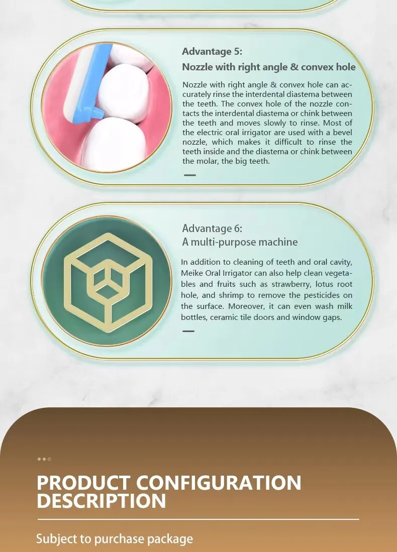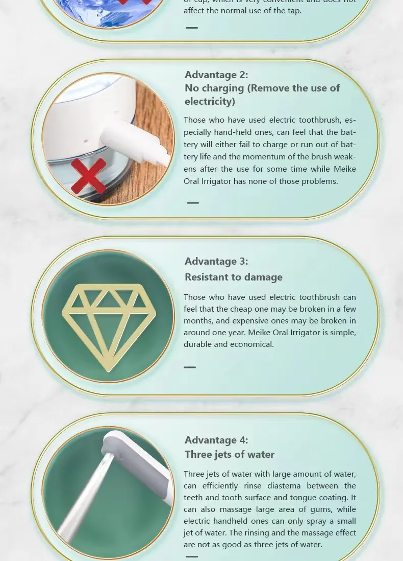 1: No charging (Remove the use of electricity). Those who have used electric toothbrush, especially hand-held ones, can feel that the battery will either fail to charge or run out of battery life and the momentum of the brush weakens after the use for some time while Meike Oral Irrigator has none of those problems.