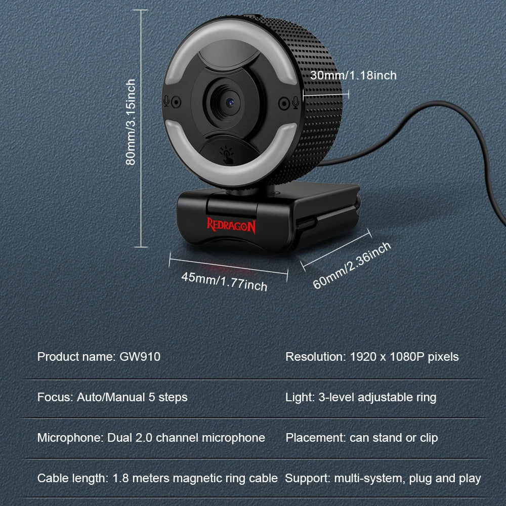 REDRAGON GW910 Oneshot USB HD Webcam autofocus Built-in Microphone 1920 X 1080P 30fps Web Cam Camera for Desktop Laptops Game PC