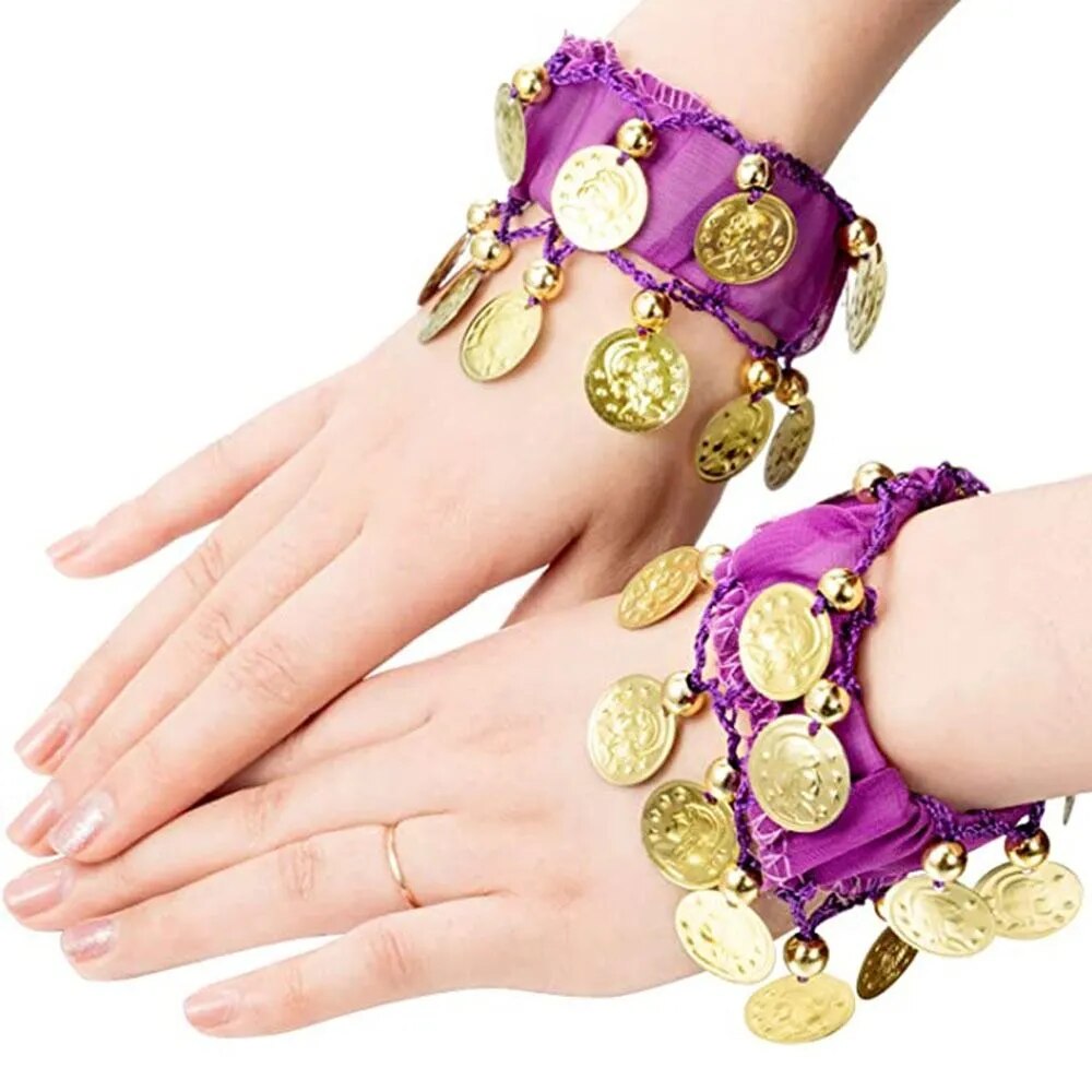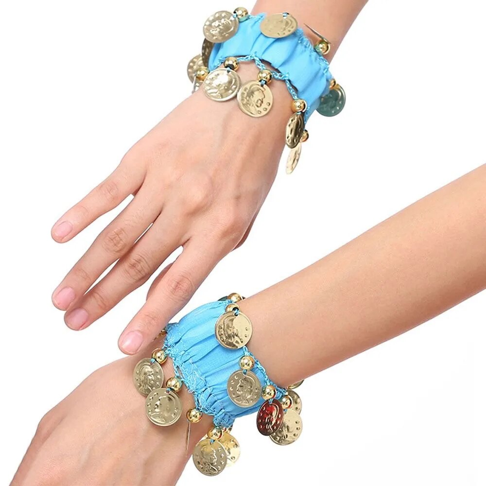1 Pair Belly Dance Wrist Ankle Cuffs Bracelets Chiffon Gold Coin Belly Dance Costume Rattle Bracelet Belly Dance Accessories