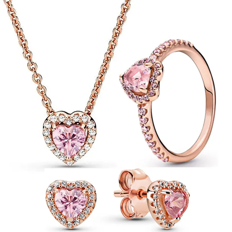 New 925 Sterling Silver Rose Gold Elevated Heart Earring Ring Necklace With Pink Crystal Fit Europe Bracelet Jewelry Gift