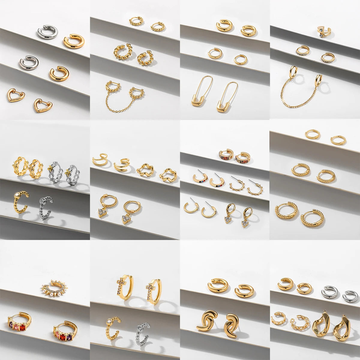 Punk Rock Helix Fake Cartilage Ear Cuff with Long Chain Circle Hoop Earrings Set for Women Tiny Piercing Huggie Earring Jewelry