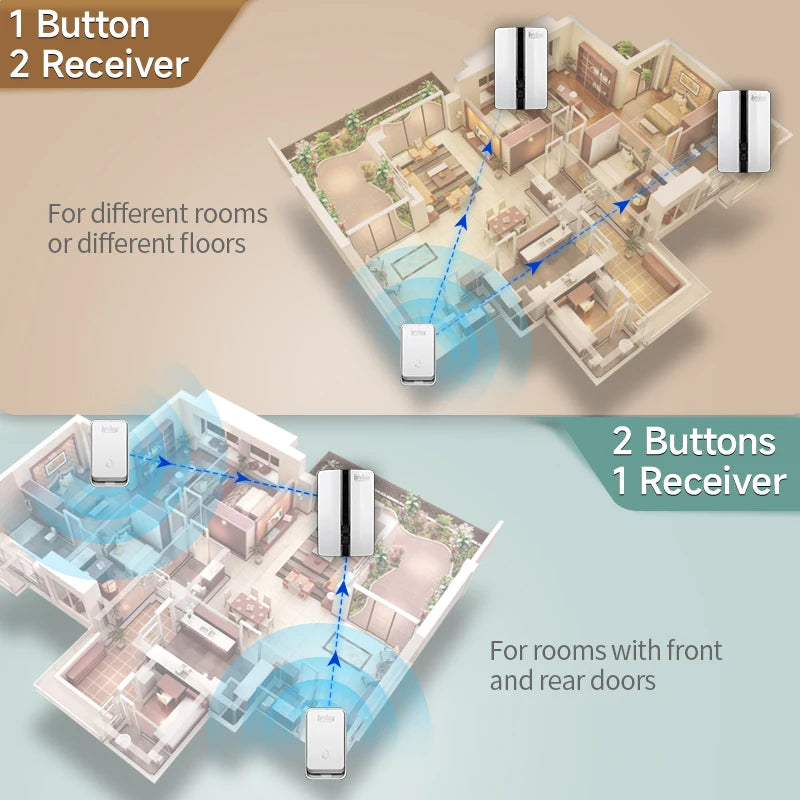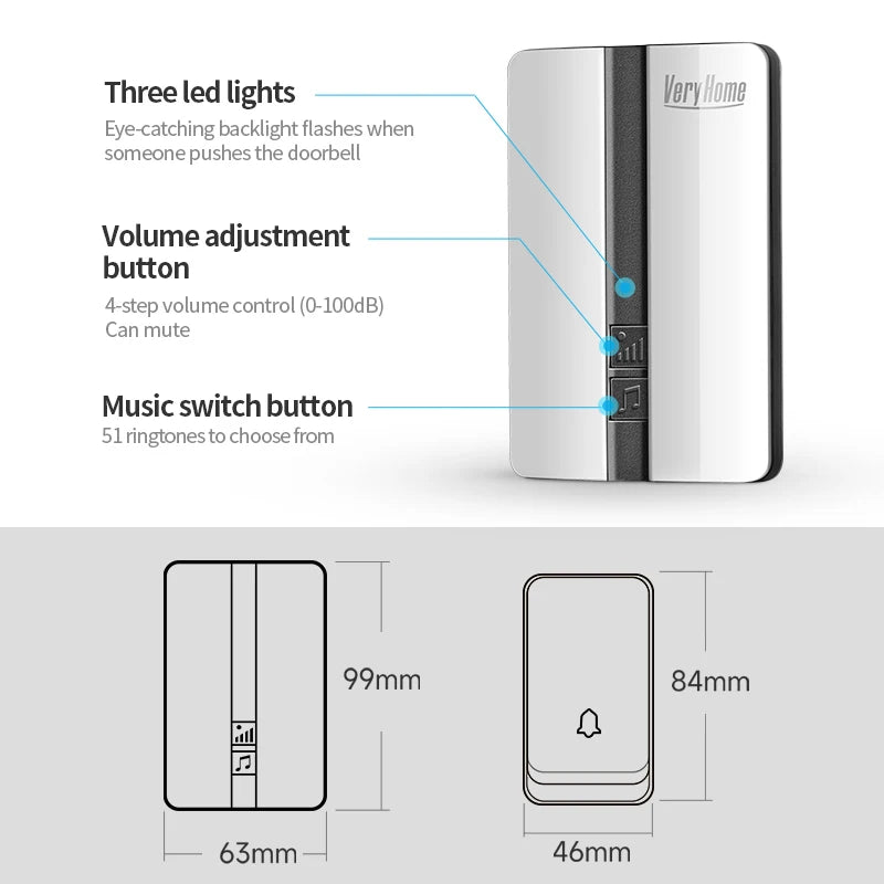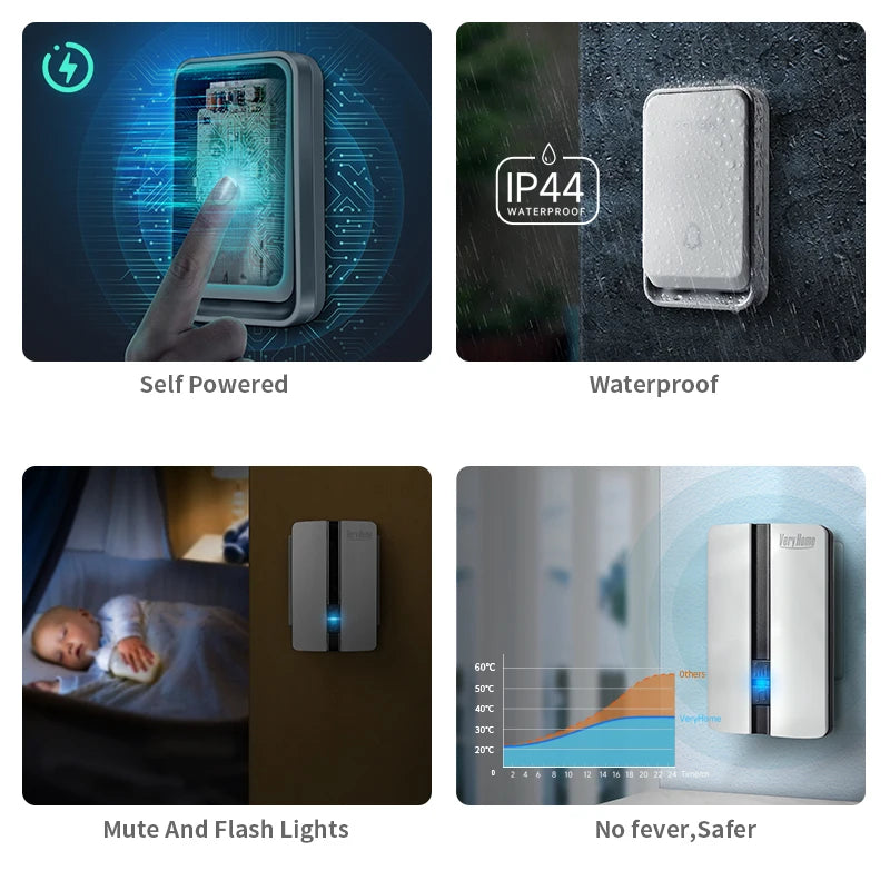 VeryHome Wireless Doorbell Waterproof Self-powered Button Smart Door Bell Sets Home Welcome Outdoor House Chimes Receiver