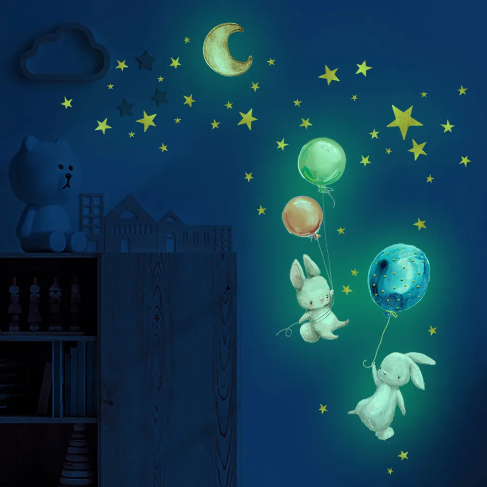 Cartoon Bunny Balloon Wall Sticker Bedroom Living Room Home Decoration Kids Room Wallpaper Glow In The Dark Cute Rabbit Stickers