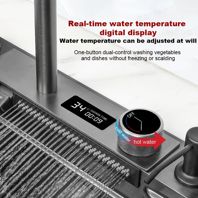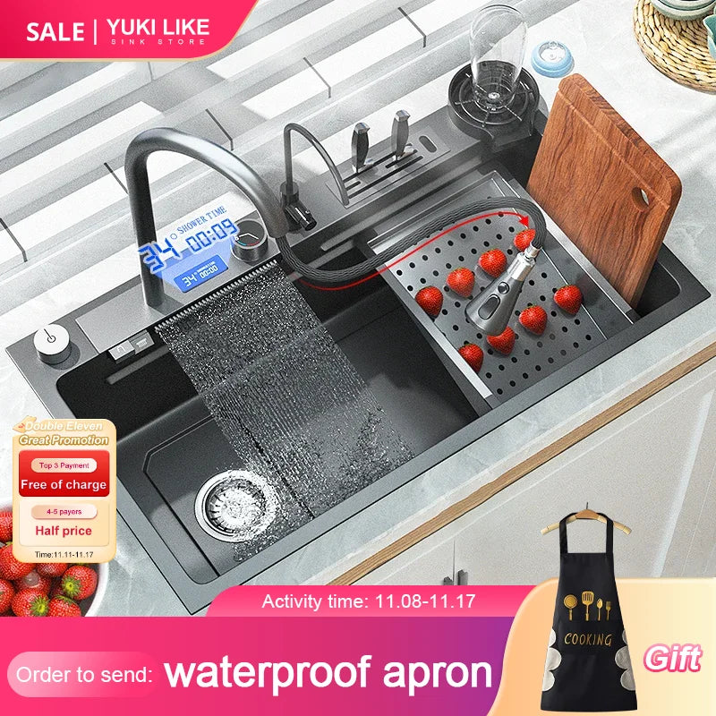 304 Stainless Steel Kitchen Waterfall Sink Digital Display Large Single Sink Dish Basin Sink With Multifunction Touch Waterfall