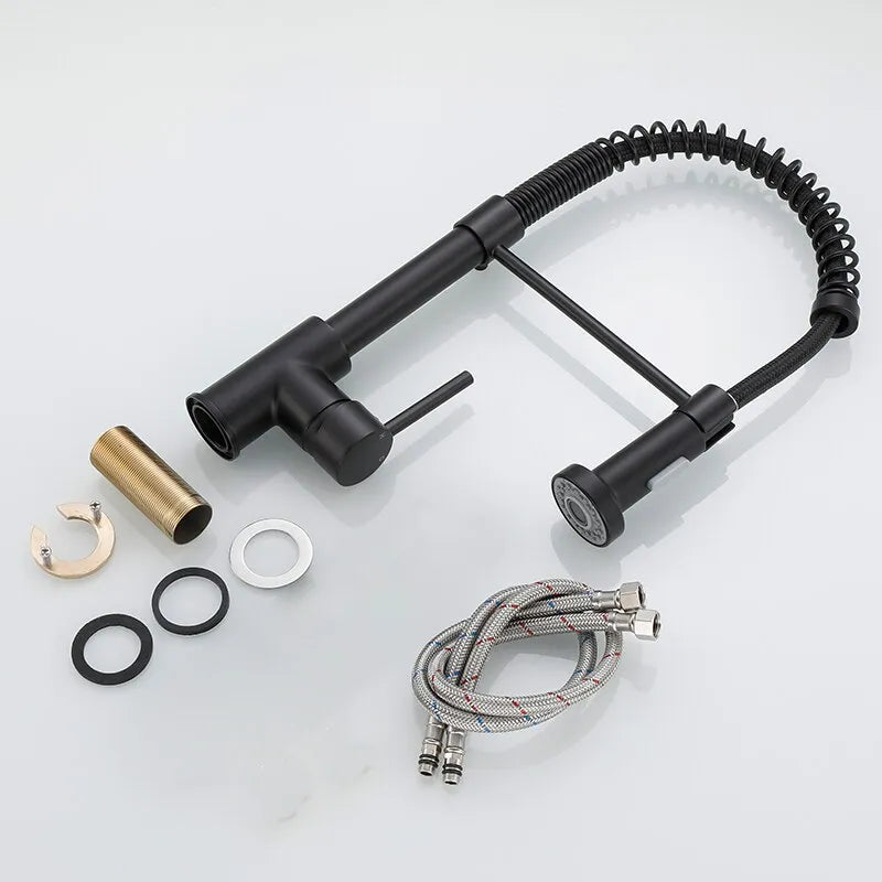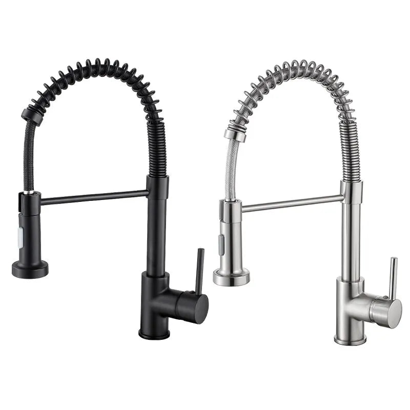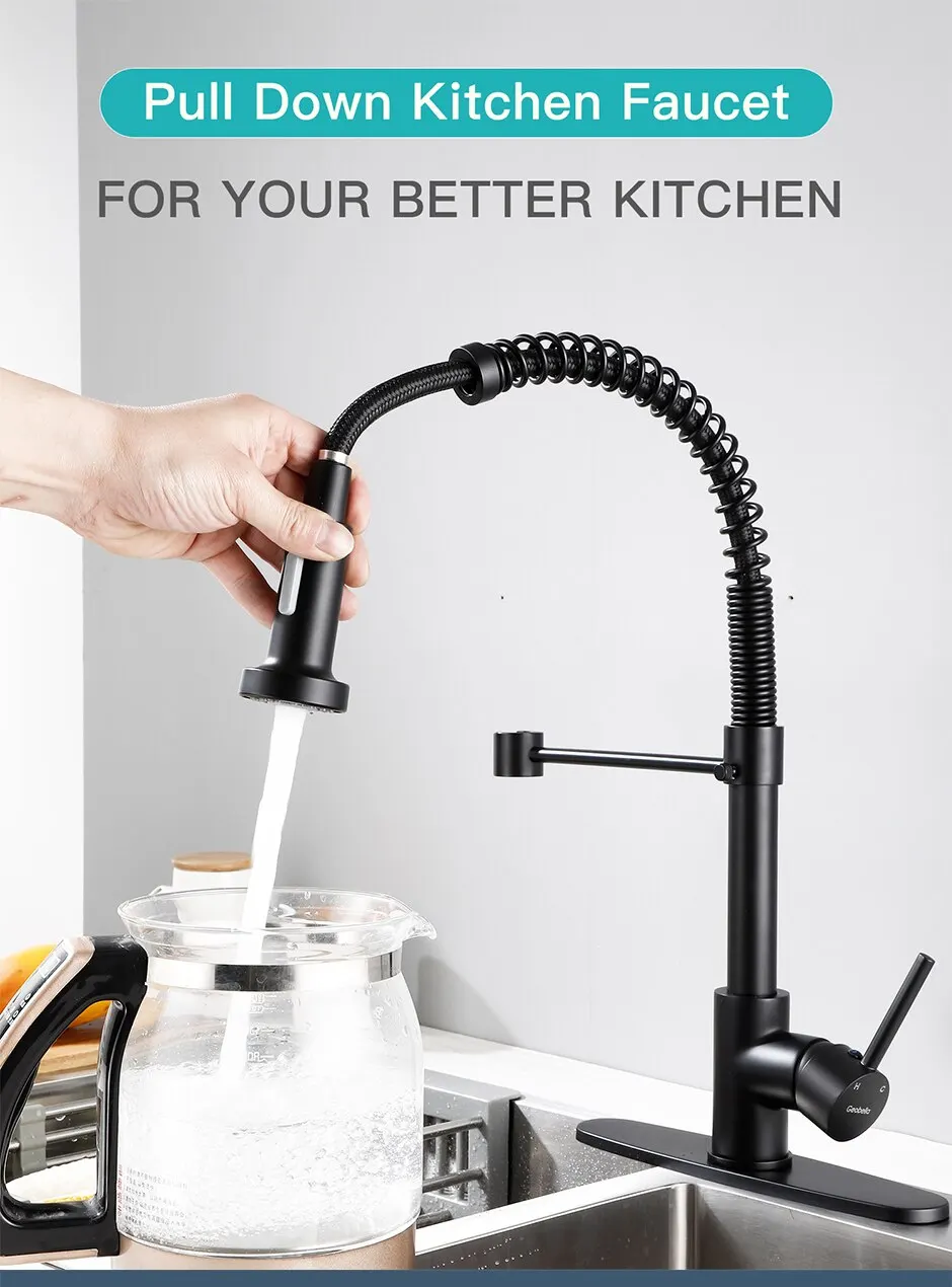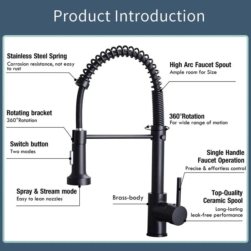 Black and Chromed Spring Pull Down Kitchen Sink Faucet Hot and Cold Water Mixer Crane Tap with Dual Spout Deck Mounted