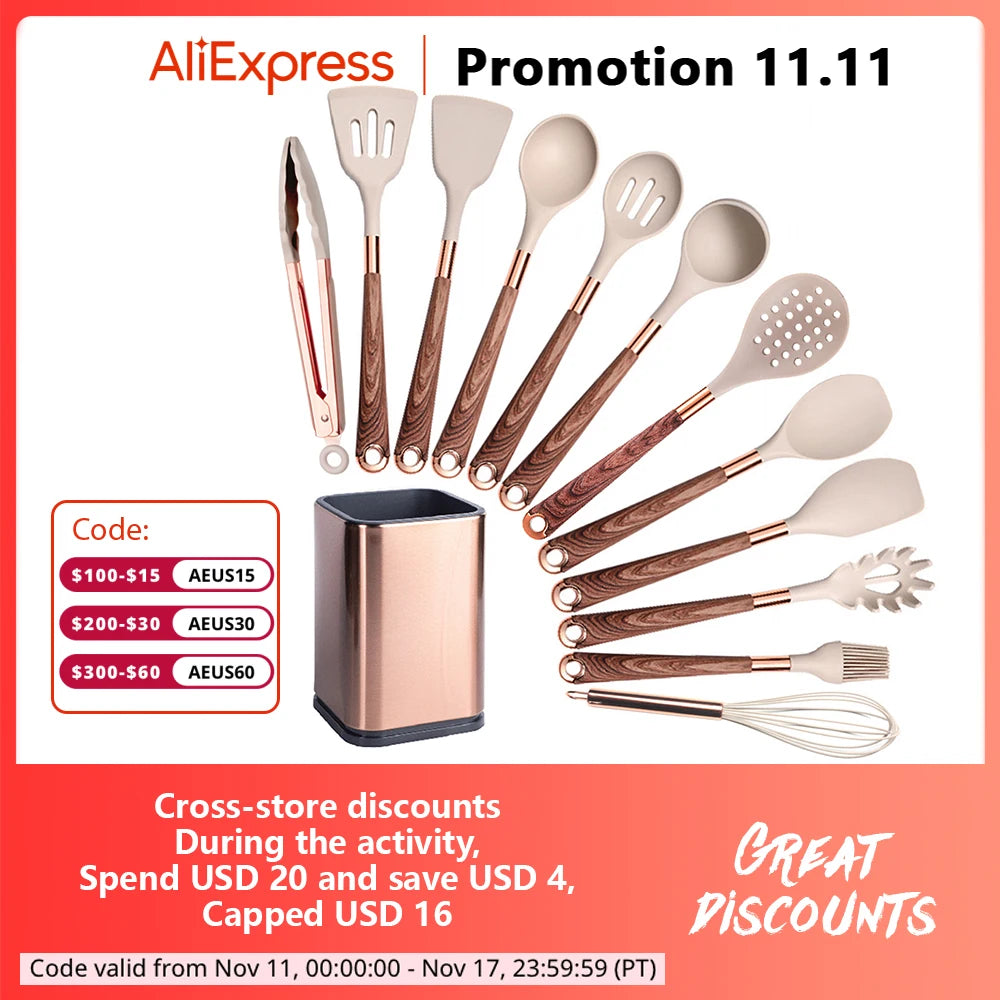 Silicone Cooking Utensils Set Kitchen Non-stick Tool Gold Plated Handle Gadgets BPA FREE Kitchenware Heat Resistant Spatula Set