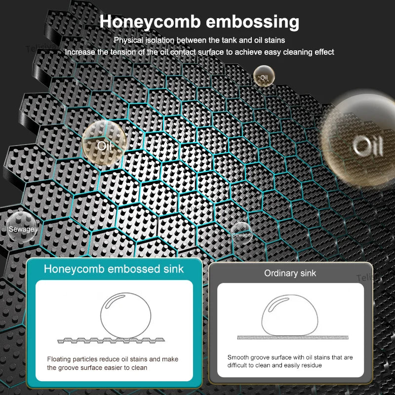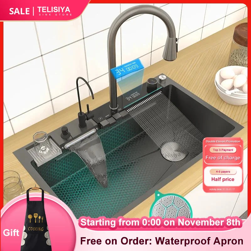 Stainless Steel Kitchen Sink Double Waterfall Integrated Digital Display Faucet Set Embossed Washing Basin For Kitchen