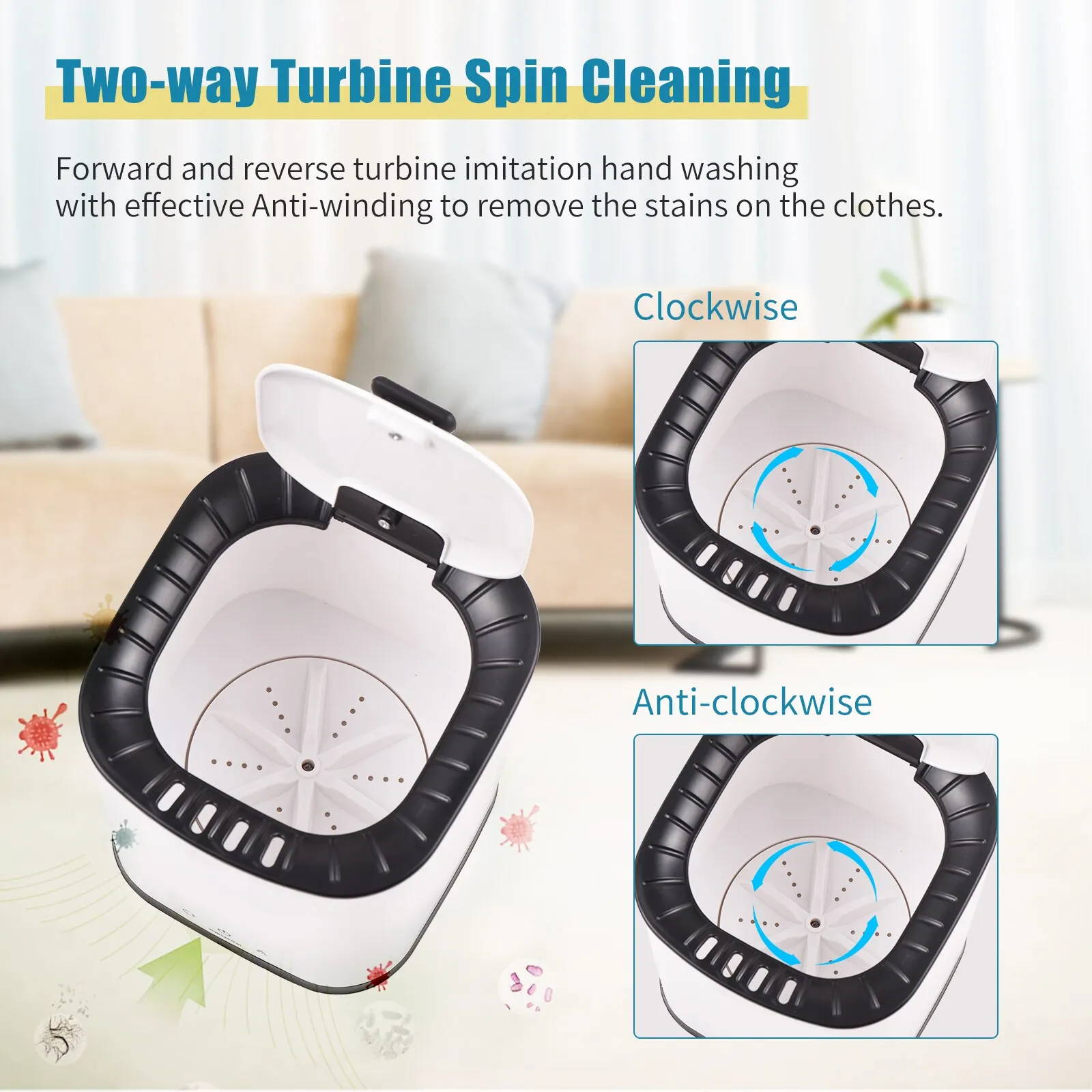 Wash underwear or socks separately from other clothing to prevent cross-infection. This mini washing machine uses a turbine for forward and reverse cleaning, clockwise and then counterclockwise, to clean clothes efficiently and quickly. Deep cycle cleaning, low noise. Don't worry about disturbing