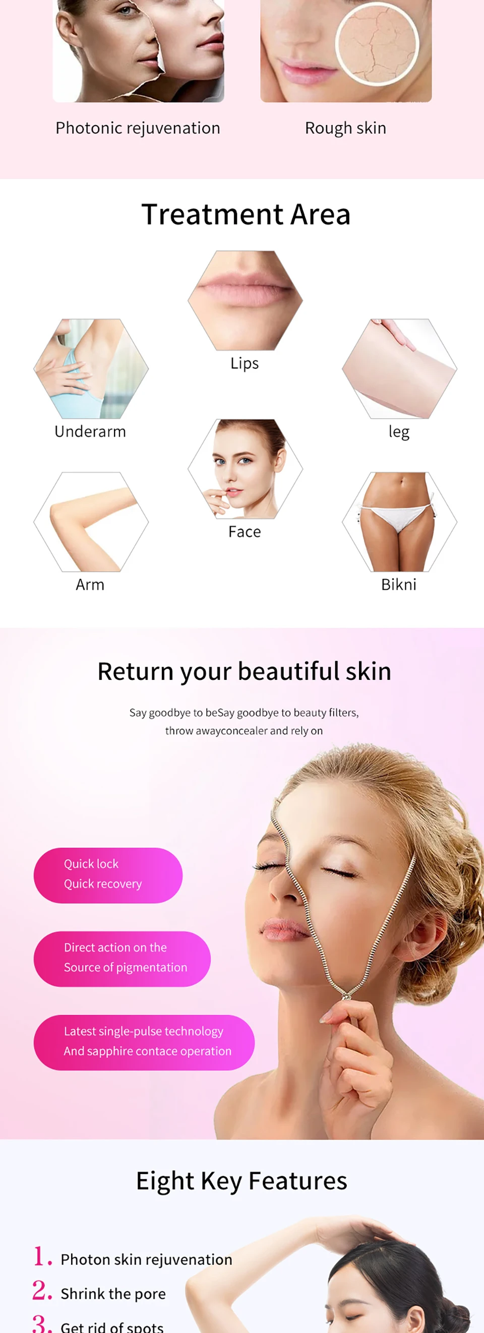 This is a technique used by beauty practitioners to perform a variety of skin treatments for cosmetic and therapeutic purposes, including hair removal, light rejuvenation (for example to treat skin pigmentation, sun damage and line veins), and relief of skin conditions such as acne.