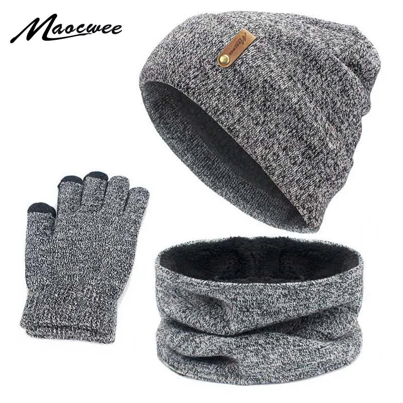 Unisex Beanies Hat Ring Scarf Gloves Set Winter Knitted Thick Warm Cap Women Men Solid Retro Beanie Hat Soft Touch Screen Gloves