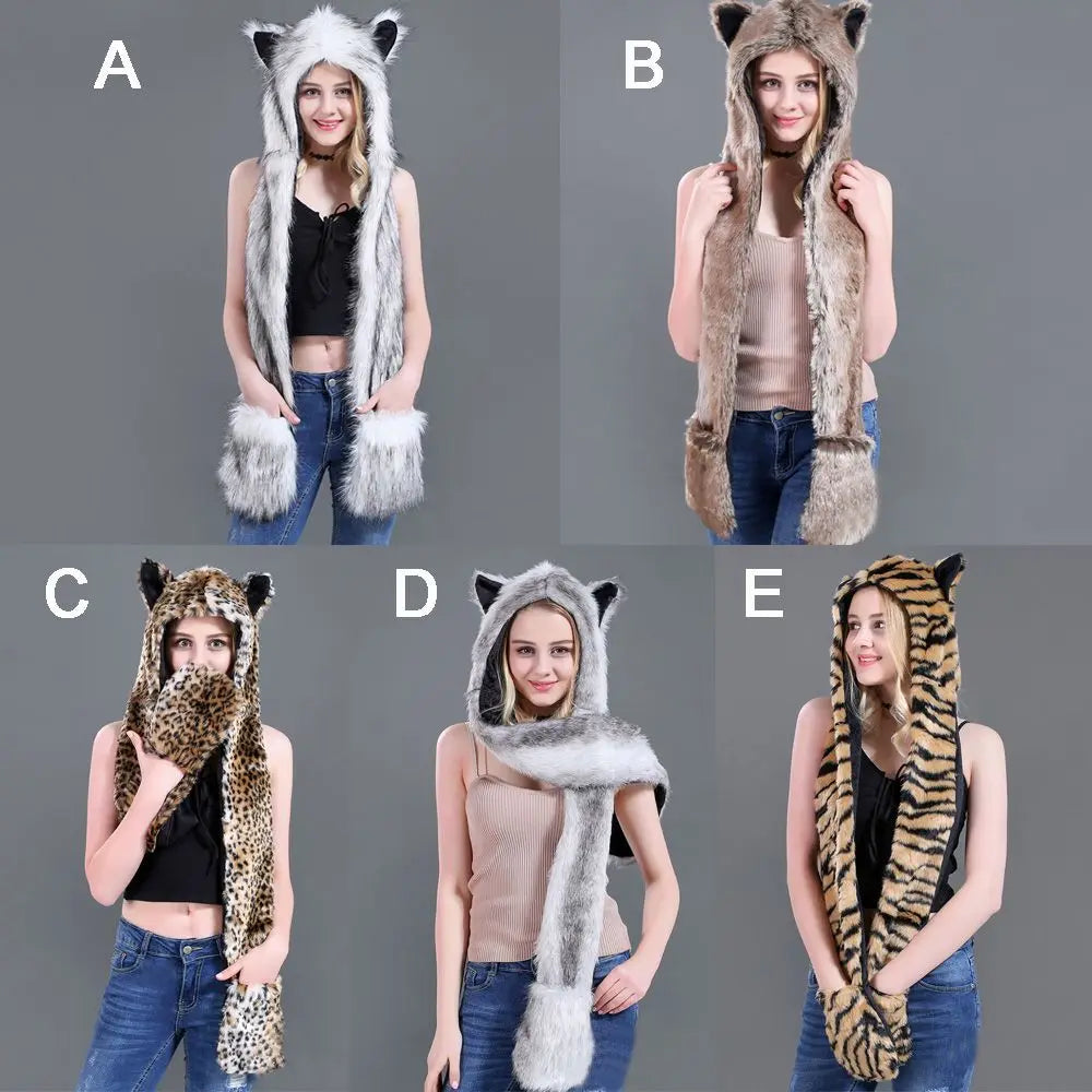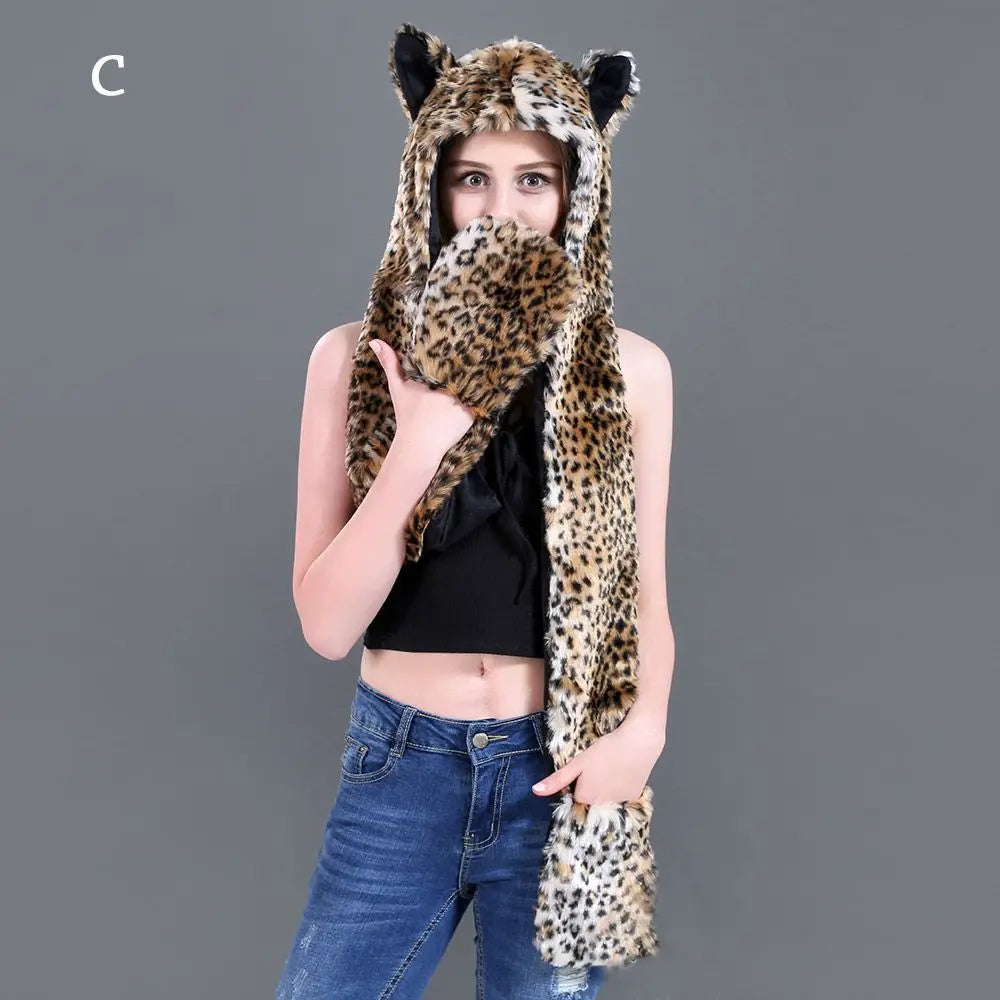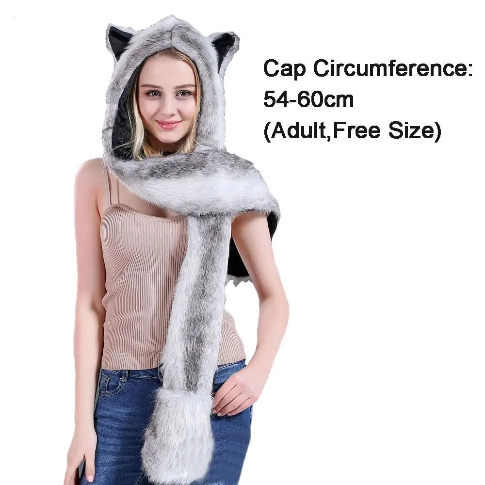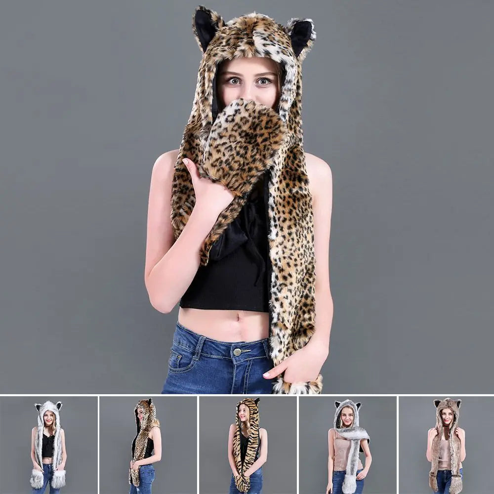 Women Ear Flaps Animal Hat Windproof Faux Fur Hood 3 in1 Animal Hat Cap with Scarf Gloves Warm Earmuff Hat