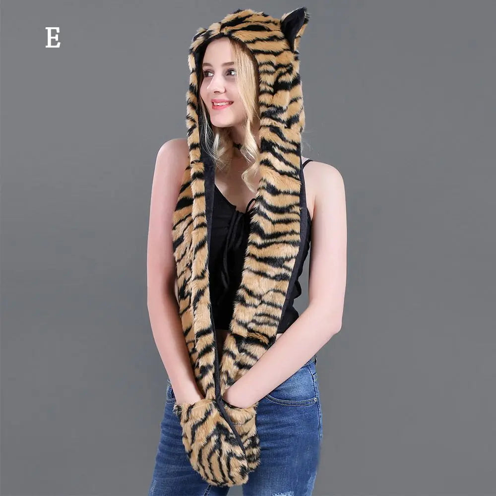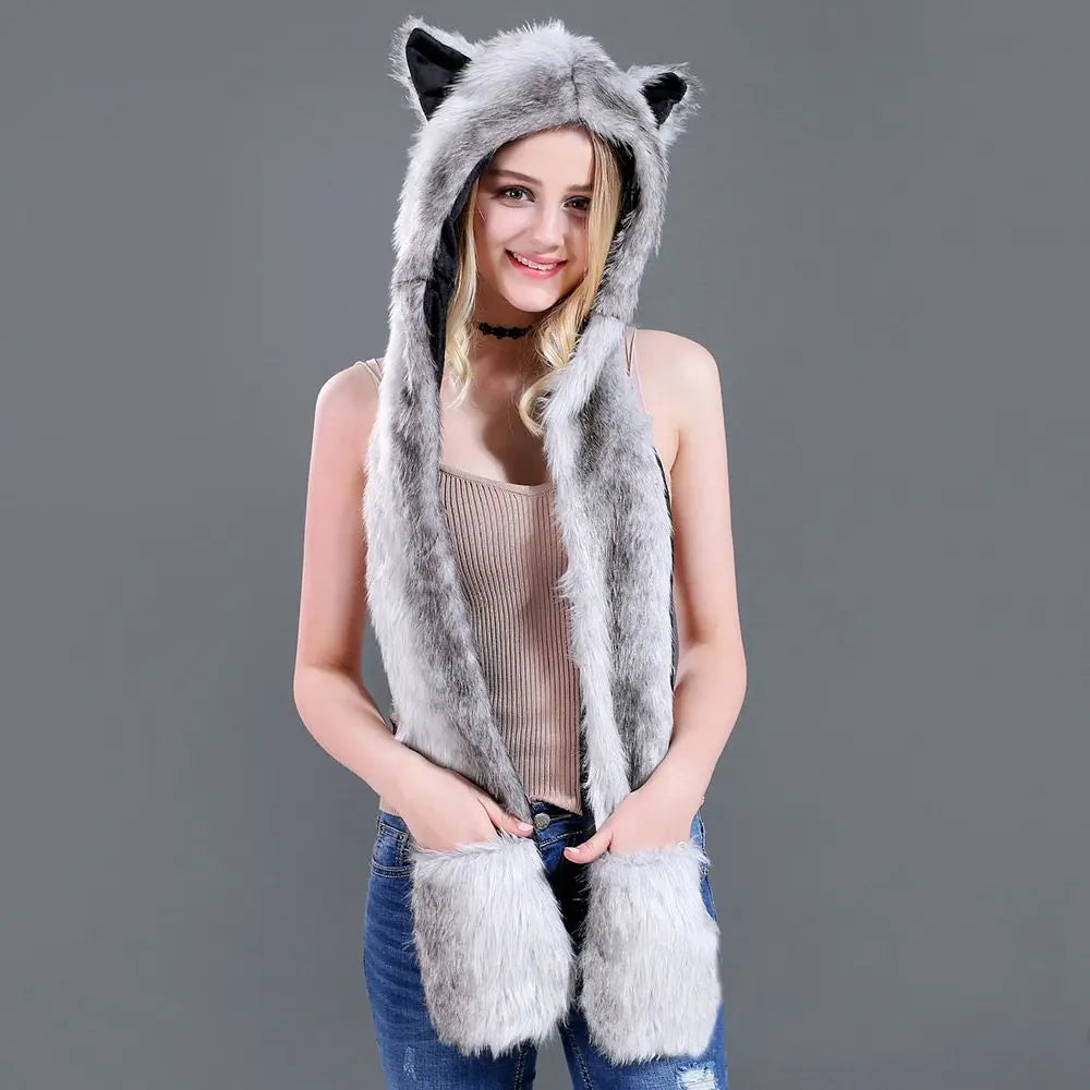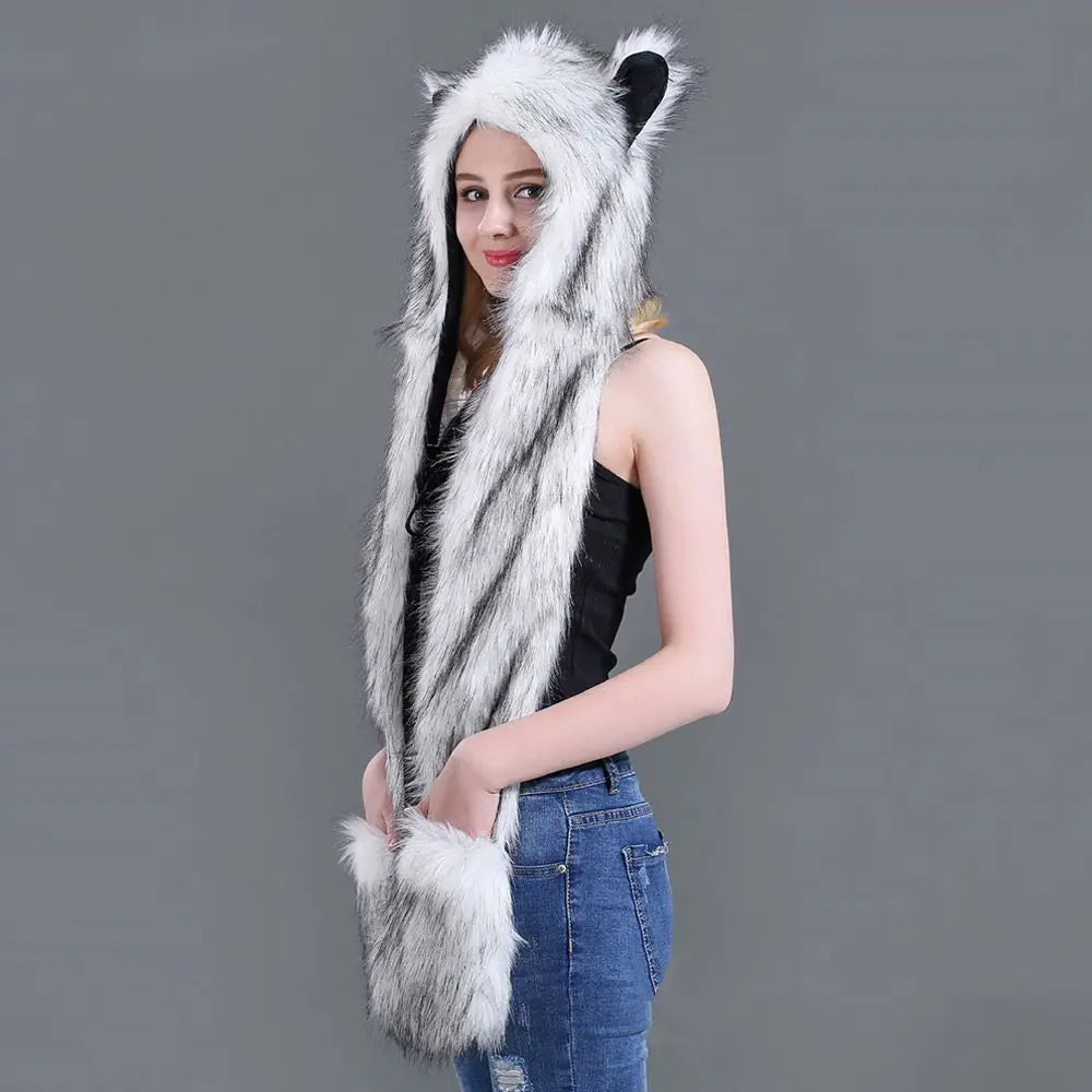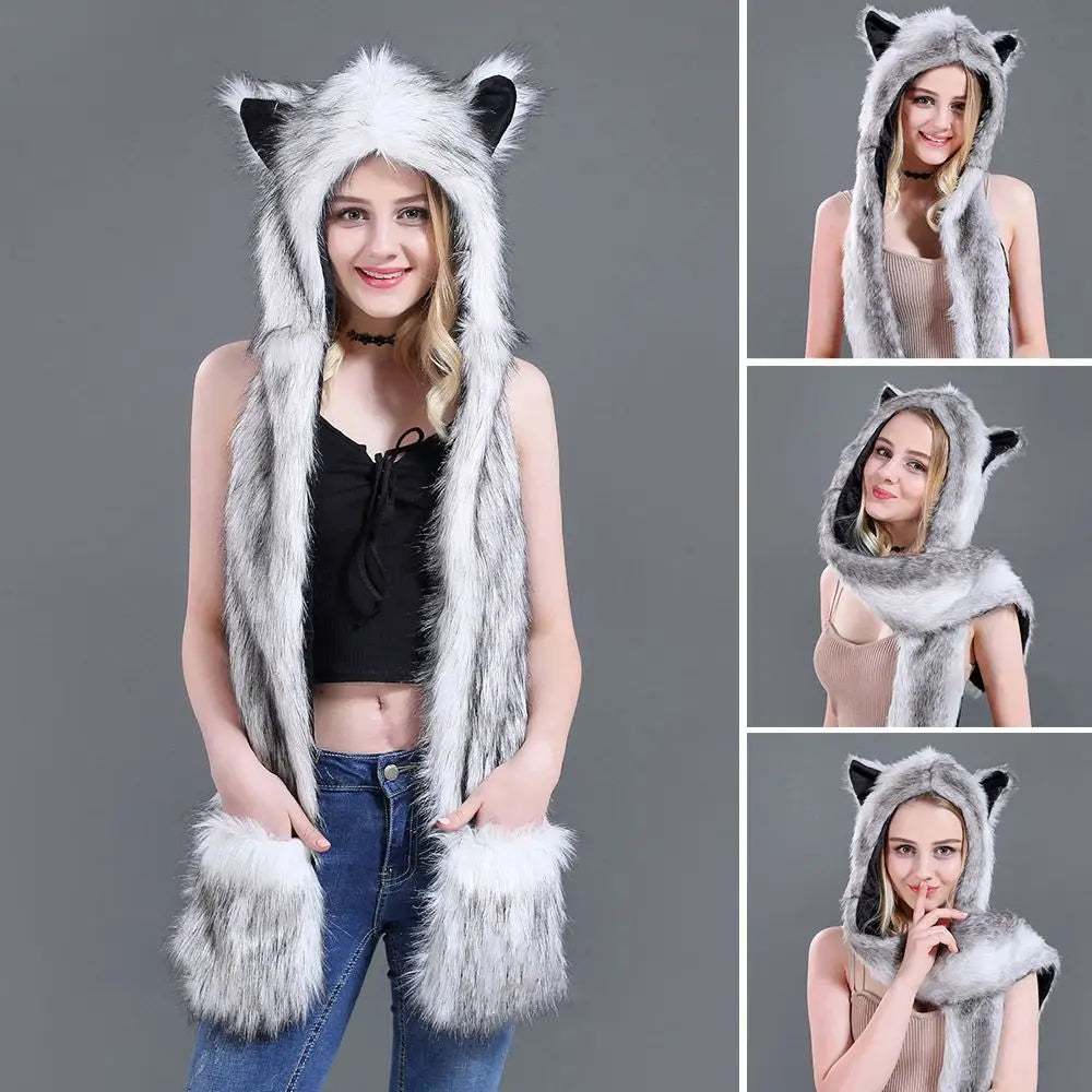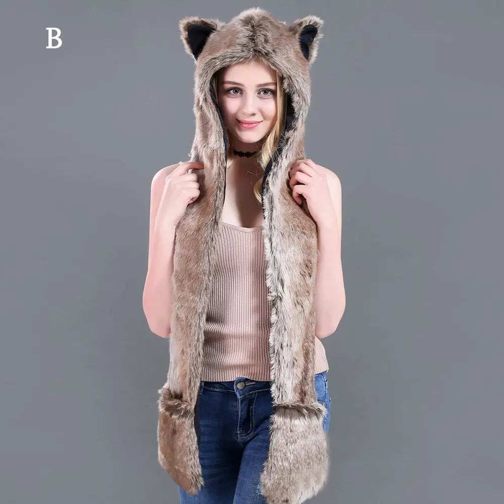 Women Ear Flaps Animal Hat Windproof Faux Fur Hood 3 in1 Animal Hat Cap with Scarf Gloves Warm Earmuff Hat