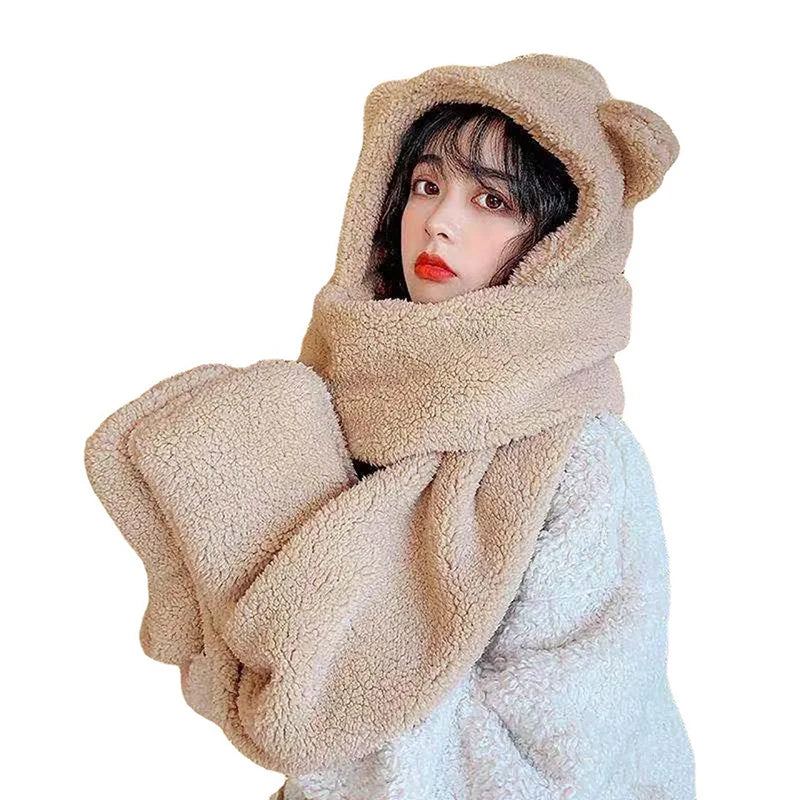 Women Scarf Hat Glove Sets Cute Bear Ear Hat For Girls Winter Warm Head Hood Plush Thicken Beanies Cap Scarf Glove 3pcs Set Gift