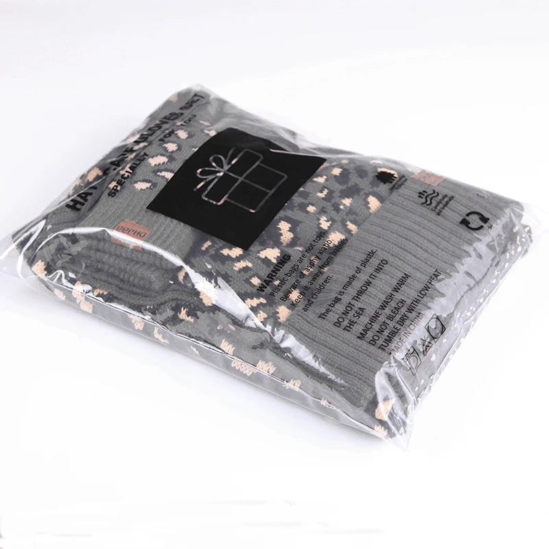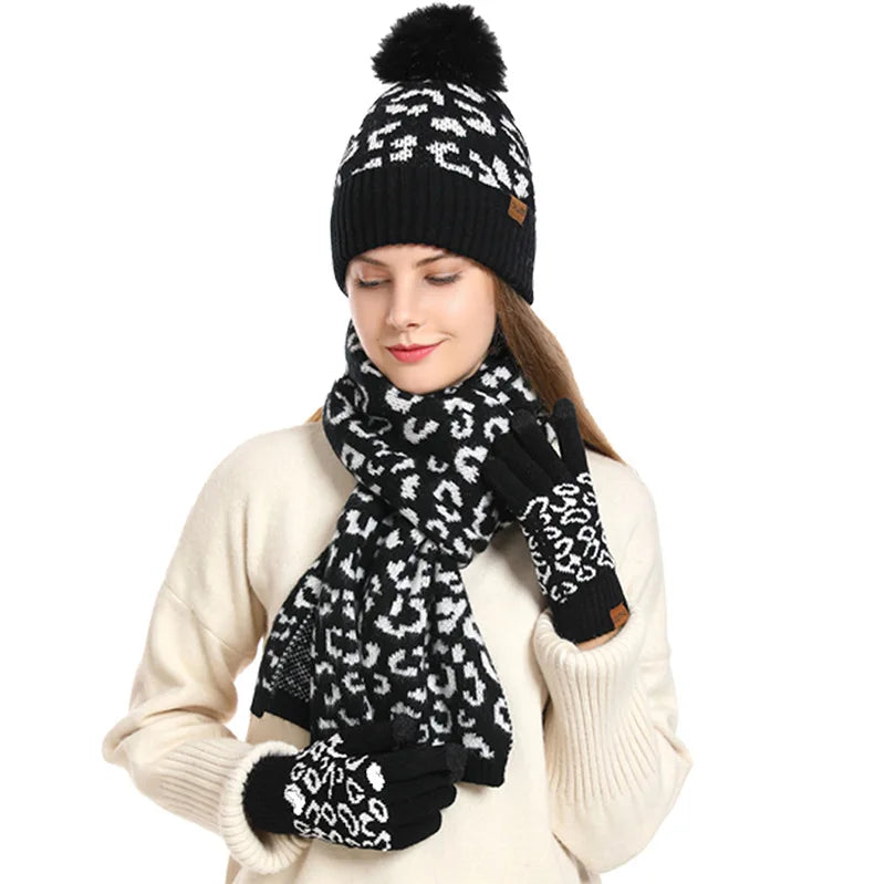 Women's Winter Keep Warm Set Fleece Lining Beanie Telefingers Gloves Thicken Scarf Knitted Muffler Hat Leopard Neckerchief