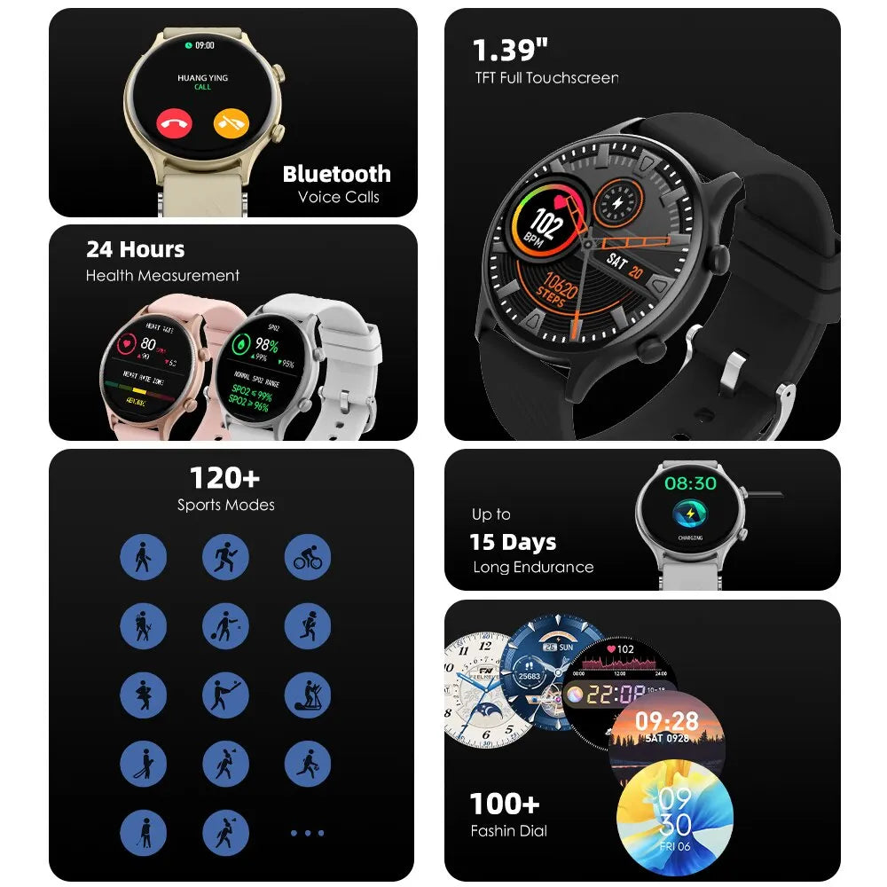 1.39" TFT Full Touchscreen | IP67 Waterproof | Bluetooth Call | 120+ Sports Modes | 24Hours Health Measurement | 100+ Fashion Dial | Build-in Games