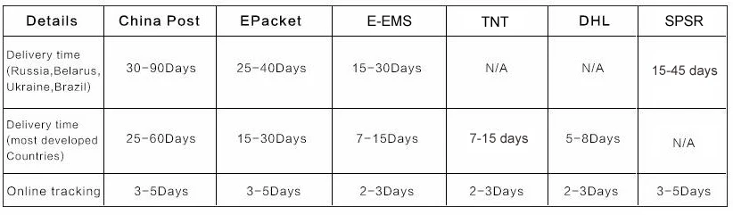 1) Normally we offer free shipping by China Post Registered Air Mail. Here we make a refernce arrival time for your reference ,
