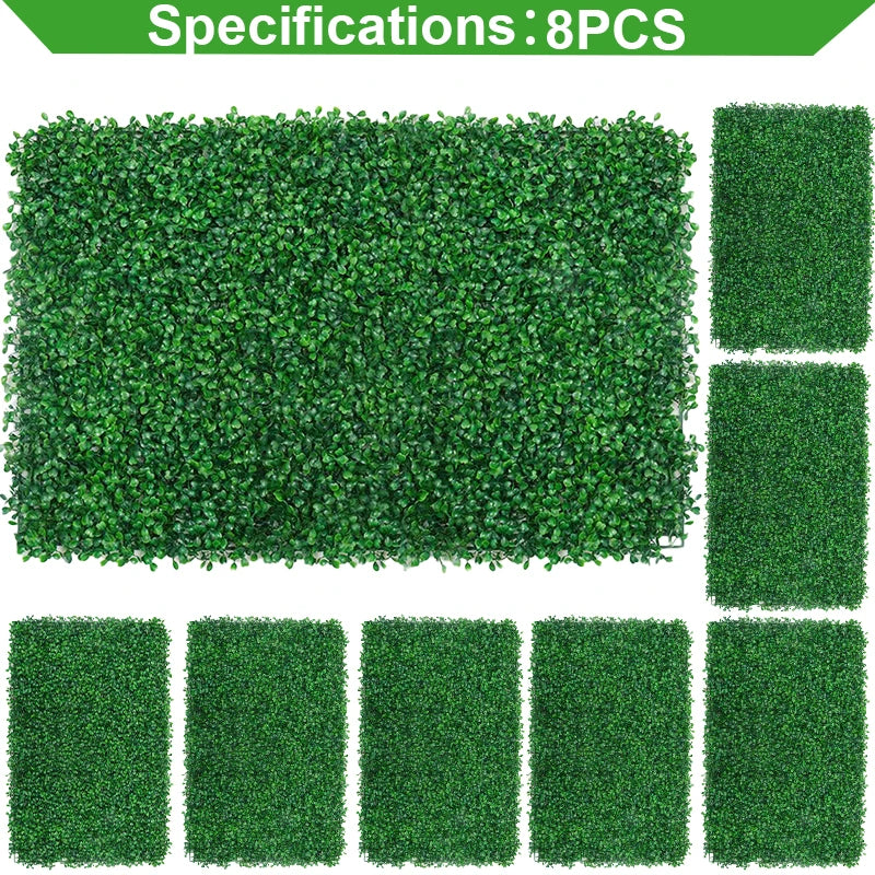 polyethylene, the artificial grass is UV-proof, weather-resistant, won't fade for outdoor usage. The leaves are clean, no water needed except for cleaning. Maintenance free, no pesticides and fertilizers required, save your time on gardening caring, and the boxwood backdrop wall will keep its fresh appearance year round